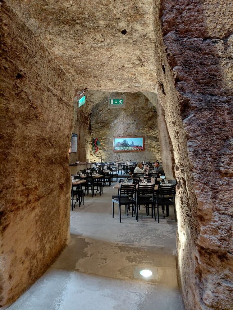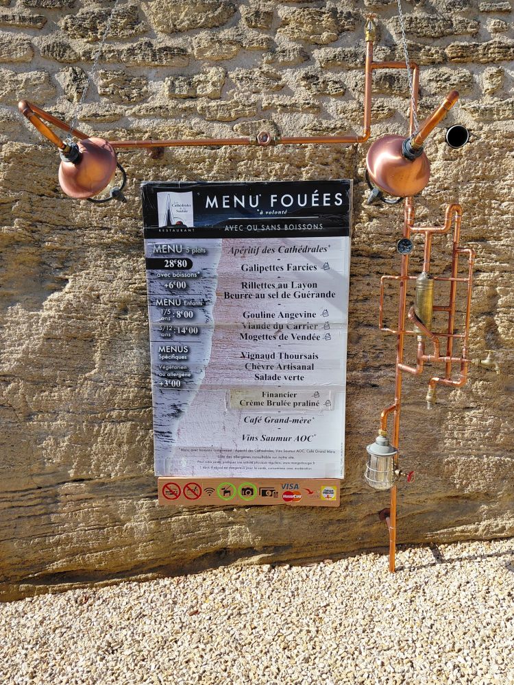 En fin de matinée c’est vers un autre site troglodytique que nous nous dirigeons « les Cathédrales de la Saulaie ». restaurant où nous avons découvert les fouées, petits pains fourrés de beurre, de rillettes, de mogettes, fromage ou autre. Après un bon repas, nous suivons un parcours historique, animé son et lumière, dans ces splendides “cathédrales” souterraines hautes de plus de 12 m, où a été extrait la roche de FALUN, cette fois-ci en blocs pour la construction des maisons.
