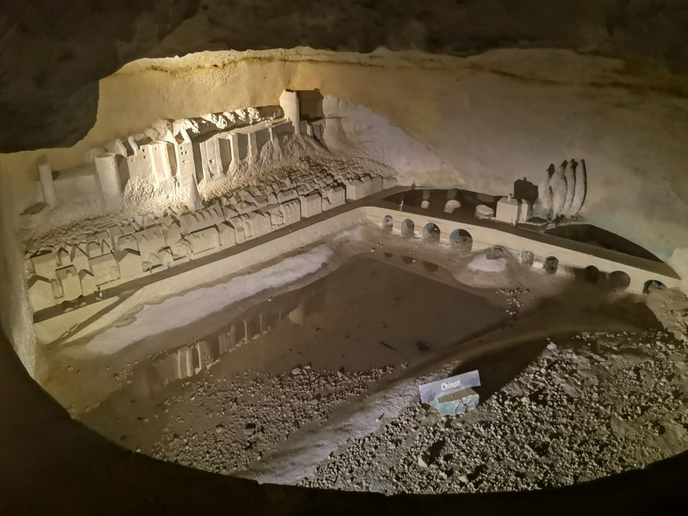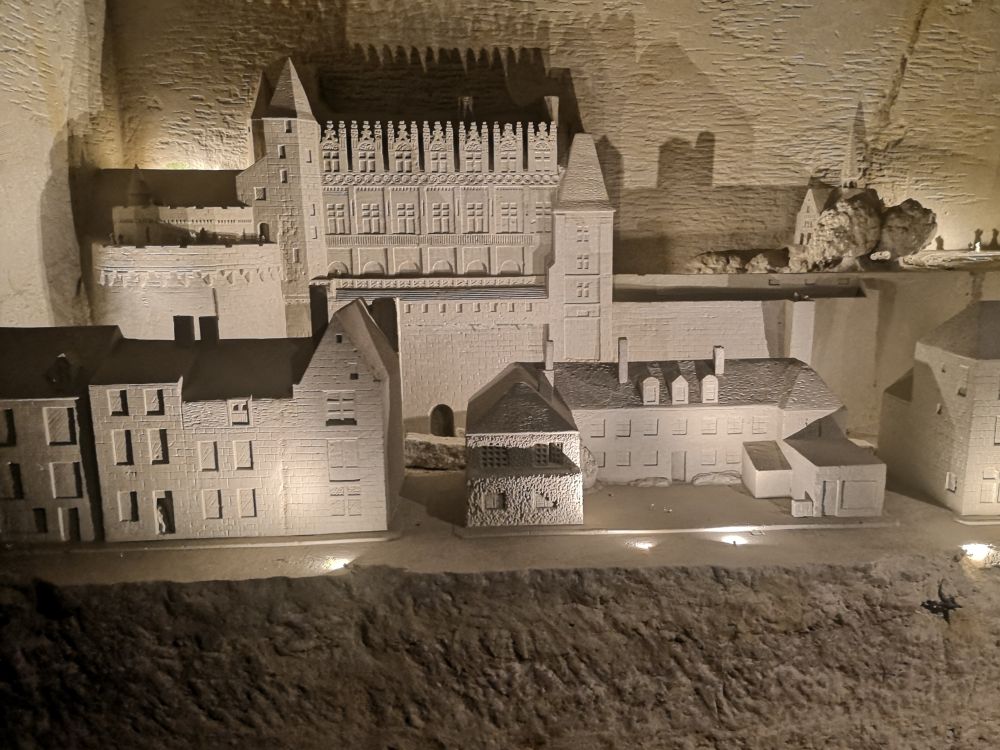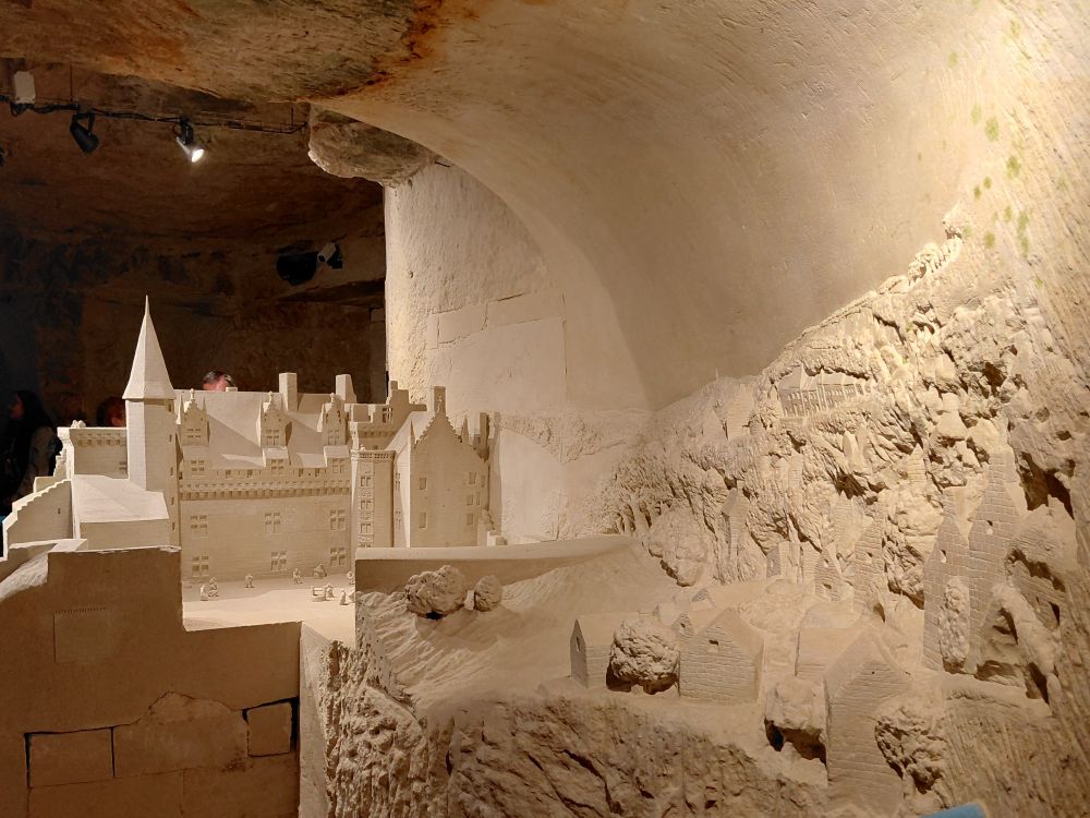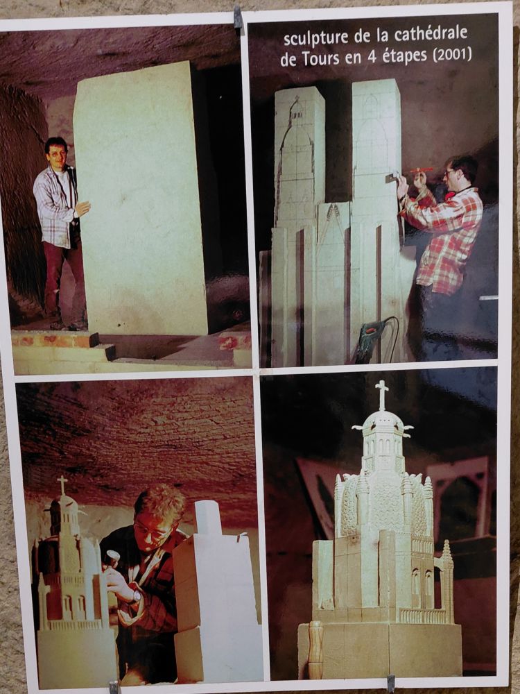 Vendredi 17 : c’est un nouveau site troglodytique, le parc Pierre et Lumière à Saint-Hilaire-Saint-Florent que nous découvrons. Cette ancienne carrière de tuffeau a été amenagée pour la réalisation d’une vingtaine de sculptures représentant les plus beaux monuments du Val de Loire taillées dans la pierre de tuffeau. Ce parc miniature souterrain est né de la rencontre de deux hommes de passion : Yann Bouchard qui en a eu l’idée, et Philippe Cormand, sculpteur autodidacte. qui passa près de 3 ans à tailler dans la pierre les somptueuses sculptures de châteaux, villes, villages et églises de la vallée de la Loire, certaines en bas-relief à même la roche.