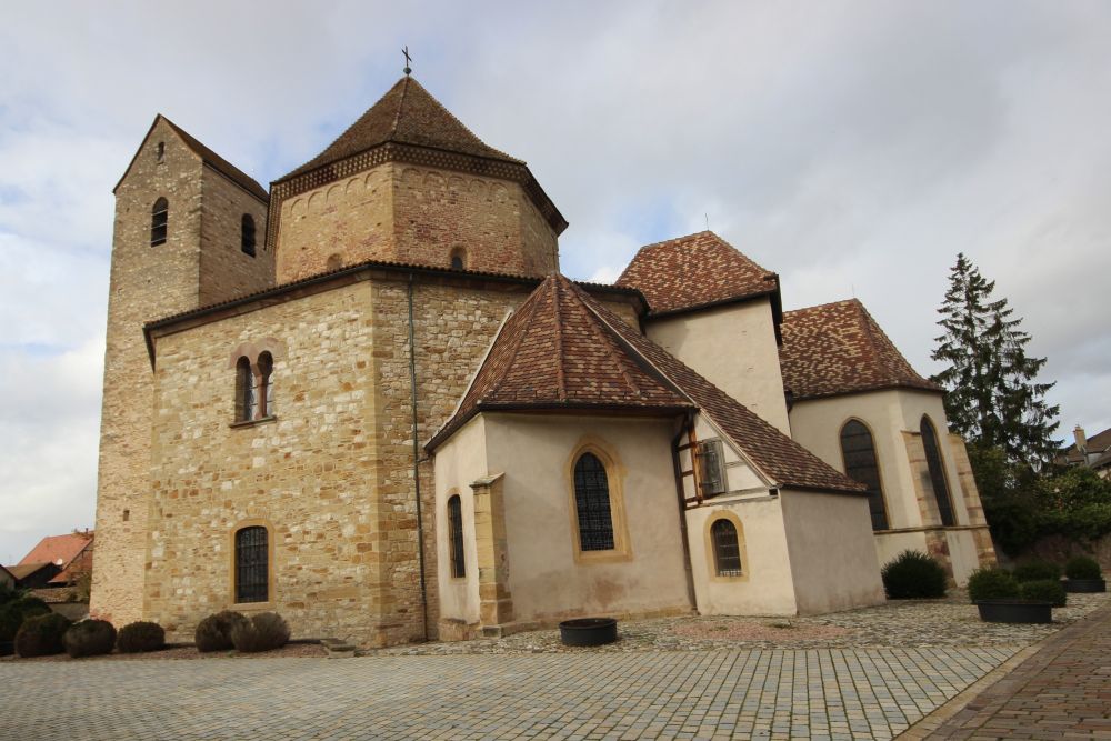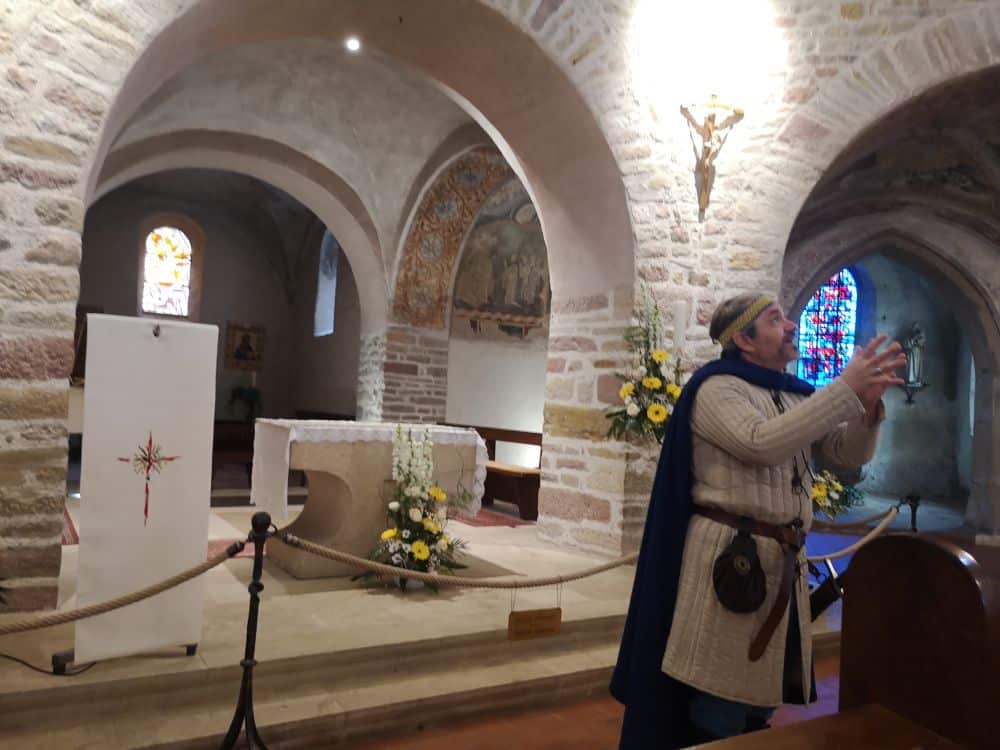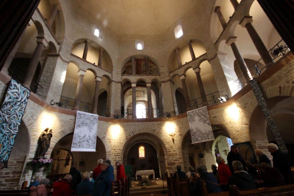 Nous nous rendons ensuite à l’abbatiale Ottmarsheim pour une visite théâtralisée ; Rodolphe, en habit d’époque, nous narre l’histoire de cet édifice à travers les siècles.