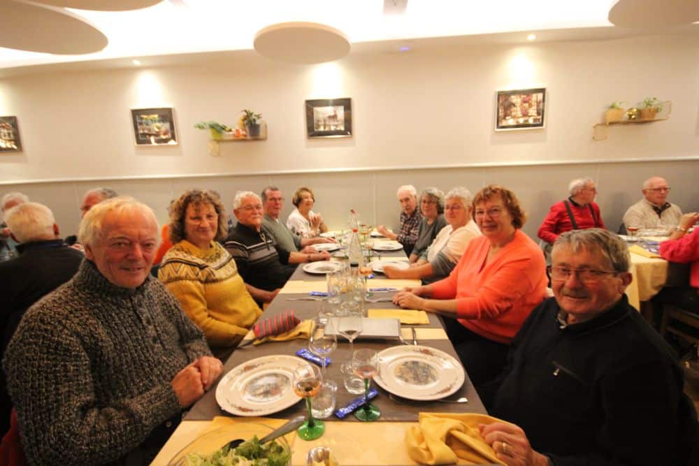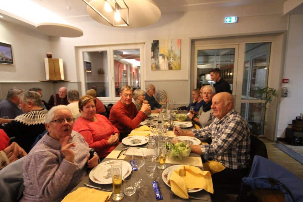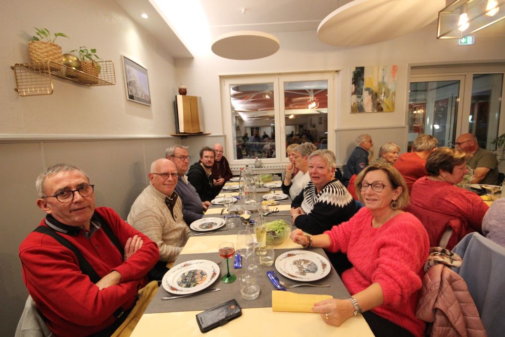 A 19h nous entrons au restaurant de la Gare où nous passons une agréable soirée autour de la spécialité régionale : carpe frite (apéro, carpes frite, frites, salade, dessert et café) ; nous avons droit à un ban normand et auvergnat. Nous quittons le restaurant à 22h30 et passons une bonne nuit sans pluie.