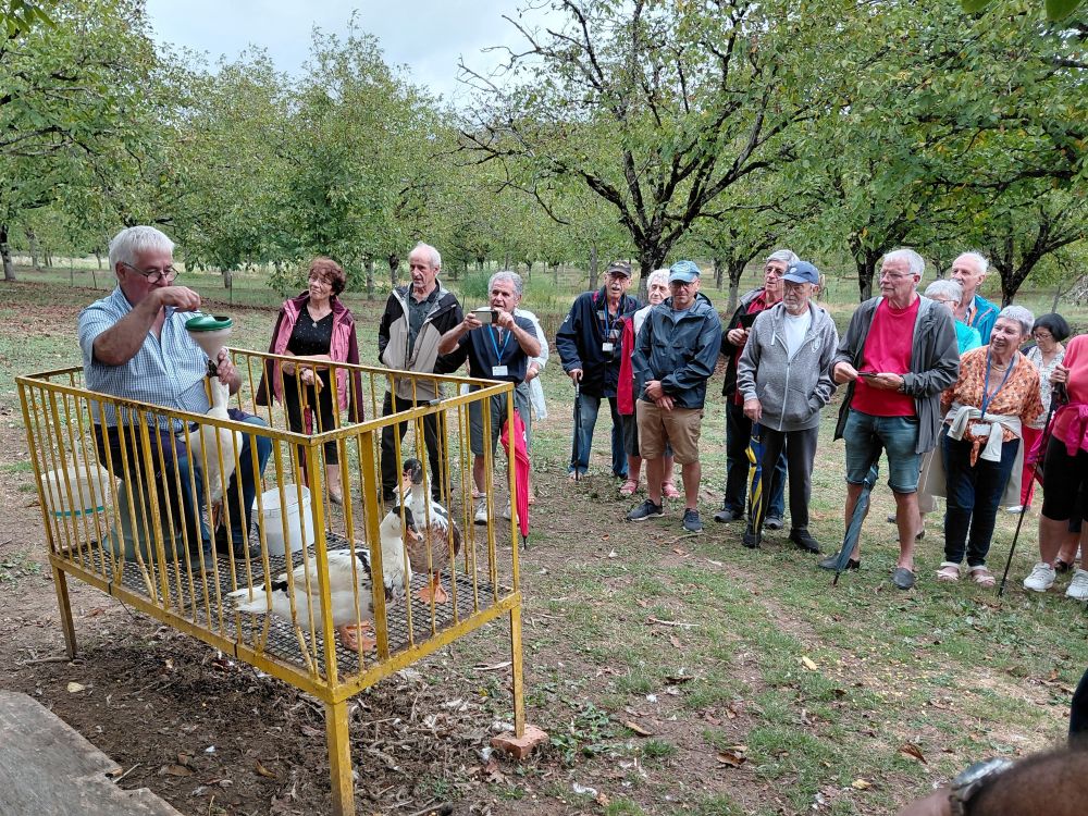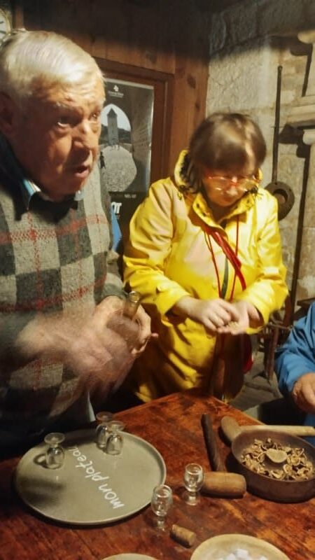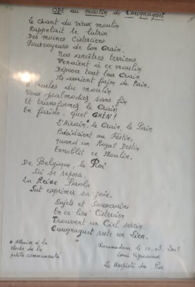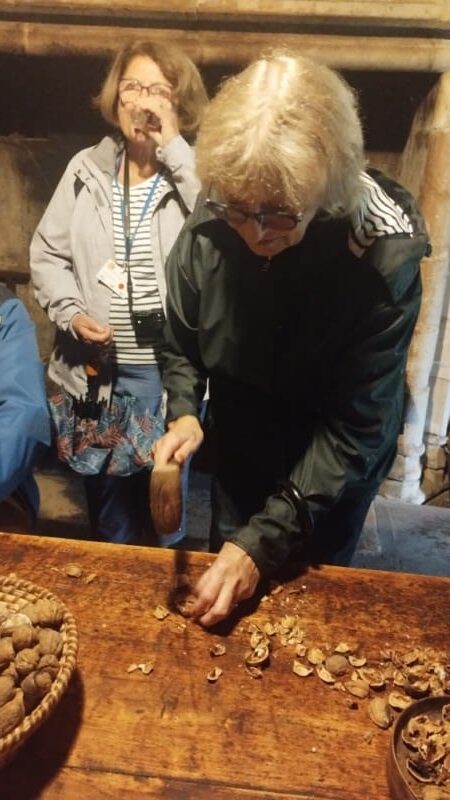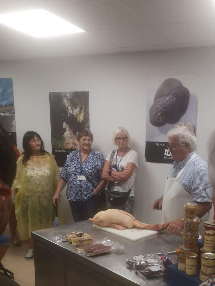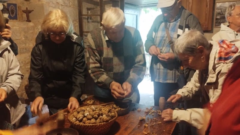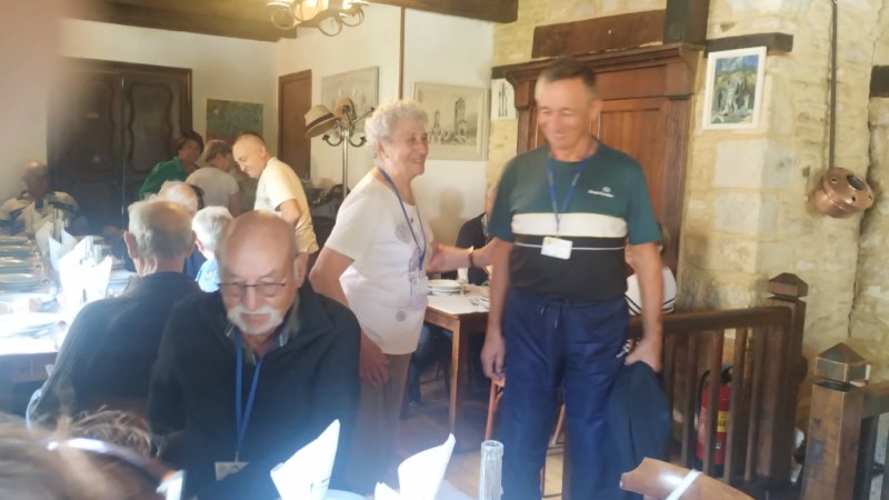 . jeudi 4 septembre: Départ vers 9h00 en bus pour la belle et surprenante visite du très vieux moulin à grain fortifié de ” COUGNAGUET” Ce moulin du XIV siècle gardé avec passion par HUBERT ce vieux Monsieur et son épouse. Avant la visite des lieux, il nous a offert des noix ( à casser sur sur un rond de bois spécifique posé sur la vieille table et un marteau en bois) accompagné presque à volonté par une fine de prune…Hummm délicieux. Ce moulin est encore totalement en fonctionnement et produit encore de la farine. Le problème est qu’il est dépassé et n’est plus rentable face à l’industrie moderne. Pendant la visite des partis basses nous arrivons dans la salle des QUATRE MEULES dont deux seulement étaient mises en fonctionnement. Nous avons reçu gratuitement, en fin de visite, un sachet de farine. Merci. Retour à Grezelade pour déguster une Assiette Quercynoise plus un dessert. Parfait !