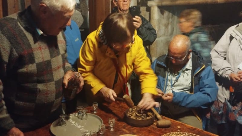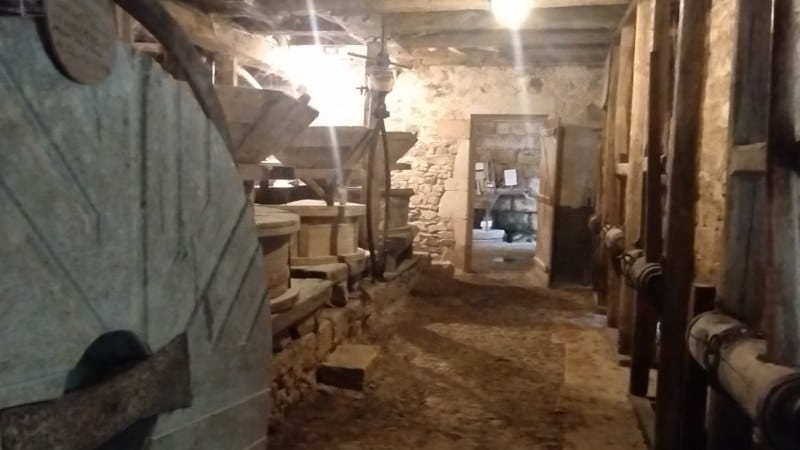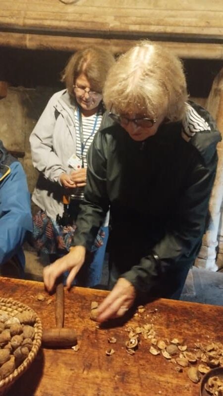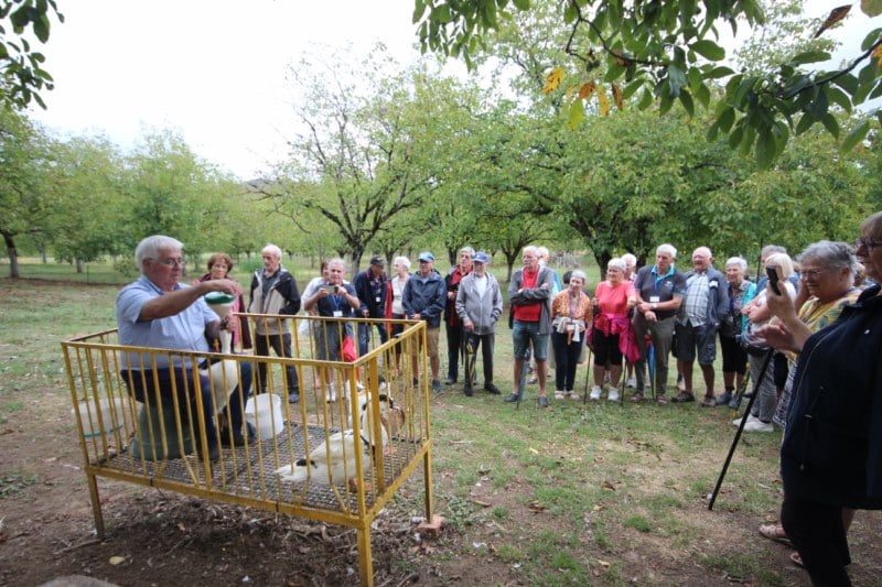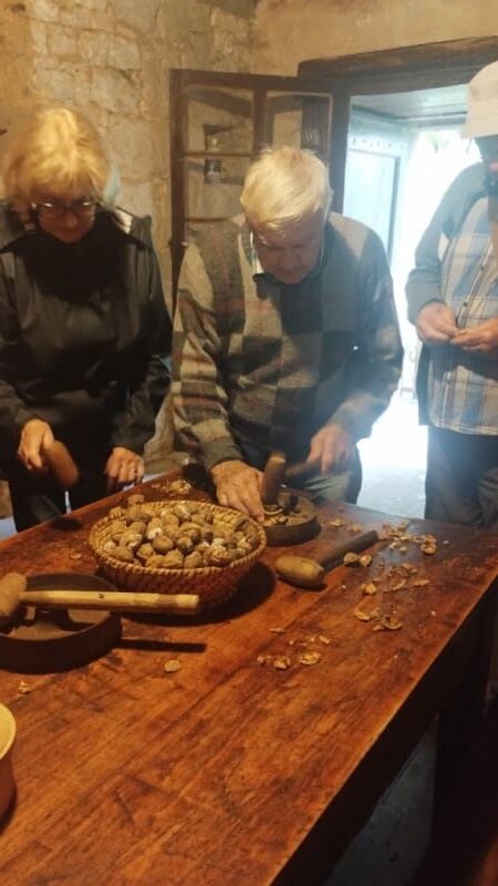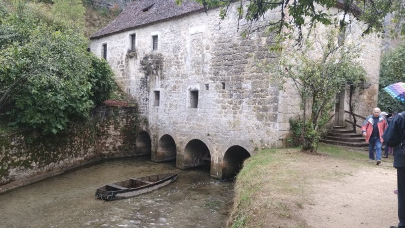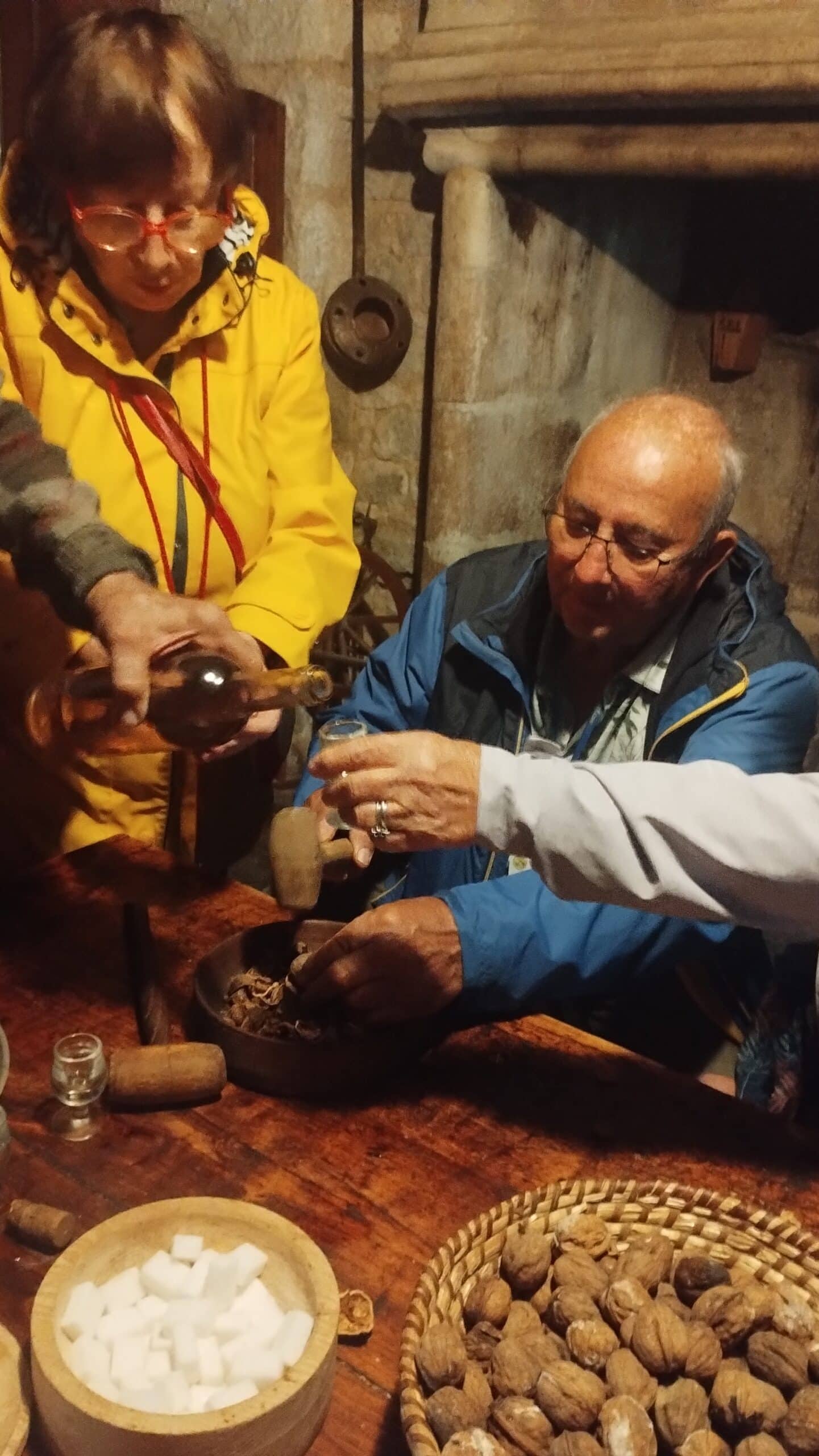 . jeudi 4 septembre: Départ vers 9h00 en bus pour la belle et surprenante visite du très vieux moulin à grain fortifié de ” COUGNAGUET” Ce moulin du XIV siècle gardé avec passion par HUBERT ce vieux Monsieur et son épouse. Avant la visite des lieux, il nous a offert des noix ( à casser sur sur un rond de bois spécifique posé sur la vieille table et un marteau en bois) accompagné presque à volonté par une fine de prune…Hummm délicieux. Ce moulin est encore totalement en fonctionnement et produit encore de la farine. Le problème est qu’il est dépassé et n’est plus rentable face à l’industrie moderne. Pendant la visite des partis basses nous arrivons dans la salle des QUATRE MEULES dont deux seulement étaient mises en fonctionnement. Nous avons reçu gratuitement, en fin de visite, un sachet de farine. Merci. Retour à Grezelade pour déguster une Assiette Quercynoise plus un dessert. Parfait !