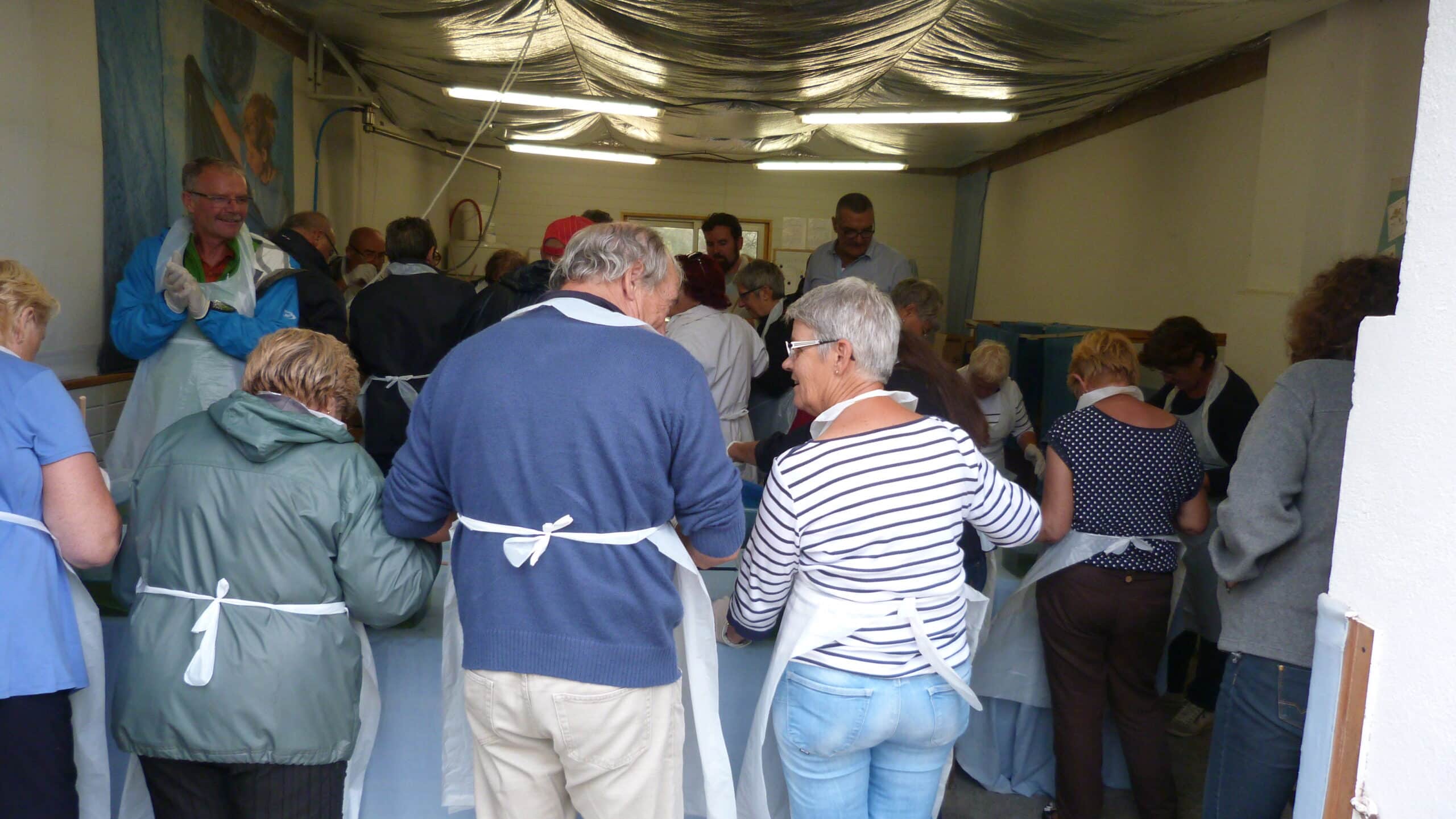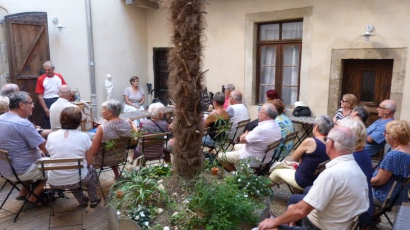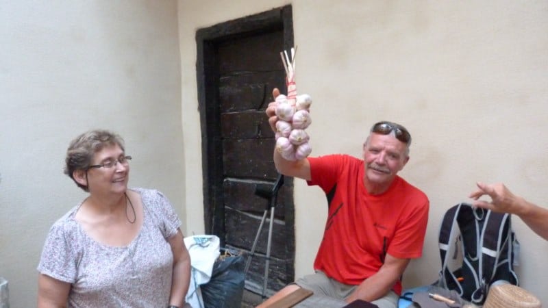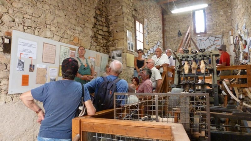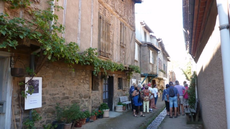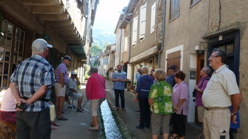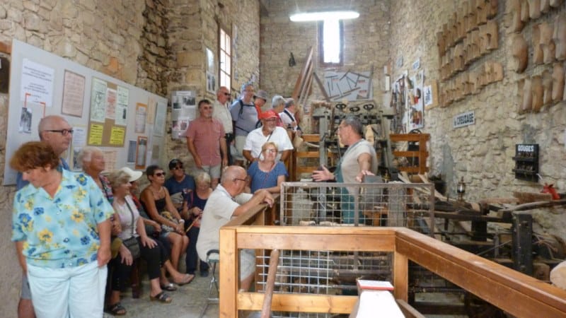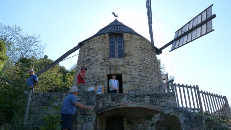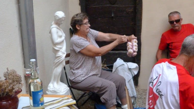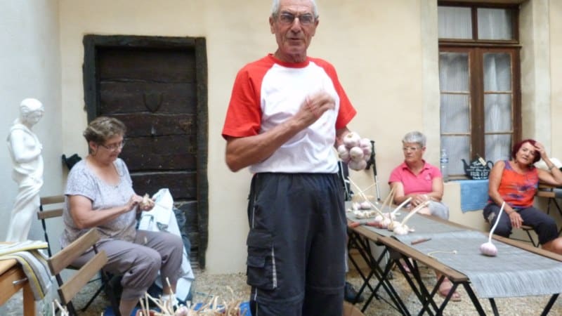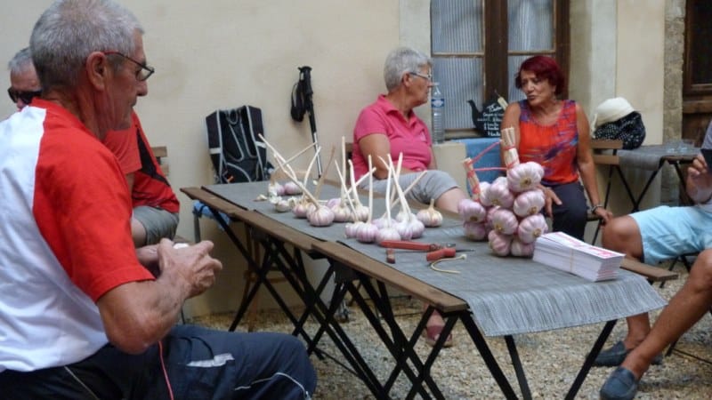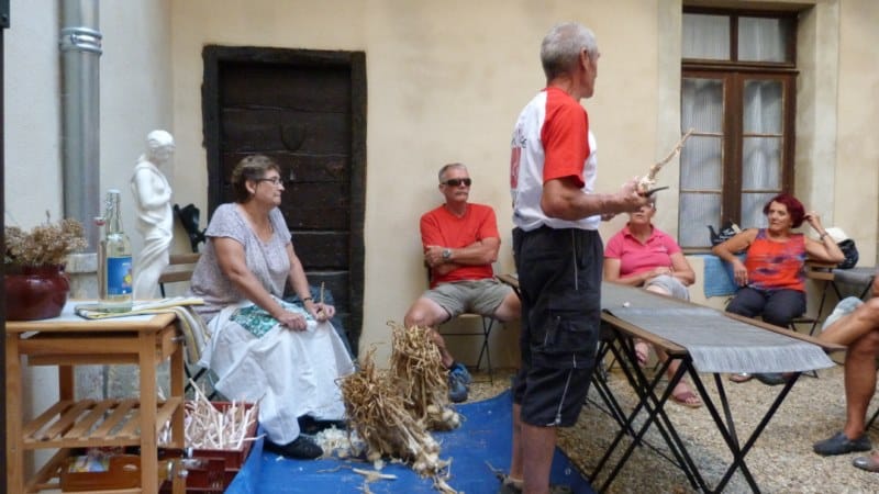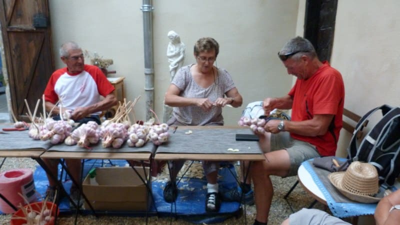 Samedi 10 Septembre :-9h30-Départ pour le parc éolien de CUQ-SERVIES, où nous retrouvons un responsable local. Nous avons, bien entendu, bénéficié de ses explications techniques interessantes. Après celà nous avons rejoint les locaux appartenant à l’organisme gérant l’installations, et avons pu poser des questions. Midi-éjeuner dans nos c.cars. A 14h, nous montons à pieds vers le village de “LAUTREC” pour une visite guidée. Sur le chemin, nous remarquons des hangars remplis de bottes d’AIL en train de sècher. L’odeur nous parvenant aux narines. Nous avons visité le vieux et beau centre du village, ces jolies ruelles bordées de vieilles maisons à colombages, son église, ses remprats (où ce qu’il en reste) puis nous avons abouti dans un vieux atelier d’un SABOTIER resté dans l’état, avec des machines de l’époque encore en fonctionnement. Une démonstration nous a été présentée. Après cette visite vraiment passionnante, nous nous sommes dirigé vers le vieux MOULIN à VENT, remis en état et maintenant en fonctionnement, permettant, lors de fêtes locales, de fournir de la farine à ceux qui en veulent. Puis, en redescendant, la guide nous amène chez un producteur “D’AIL ROSE” qui nous propose gratuitement un bol de “SOUPE à L’AIL” vraiment délicieuse ( nous avons eu du rab!). Cette dégustation fut suivie d’une démonstration de constitution de tresses de un Kilo. Bravo à Jean DENIS qui a été le meilleur!. Repas du soir et bivouac sur le parking.