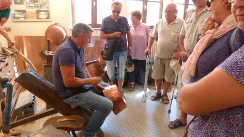 Mardi 13 : Visite guidée de la cité, nous découvrons Au milieu de certaines vieilles rues, un écoulement d’eau au centre de la ruelle, existe encore et fait penser aux artisans de l’époque qui travaillaient certains matériaux. Les jolies ruelles moyennageuses nous offrent de belles façades à colombages bien entretenues. -10h30 visite guidée du Musée du cuivre, où nous apprenons toute l’histoire de cet artisanat. Un petit arrêt chez un artisant de fabrique d’objets en cuir de haute qualié, puis allons visiter une usine de fabrication de vêtements de montagne de haute qualité en plume d’oie “TRIPLE ZERO”.