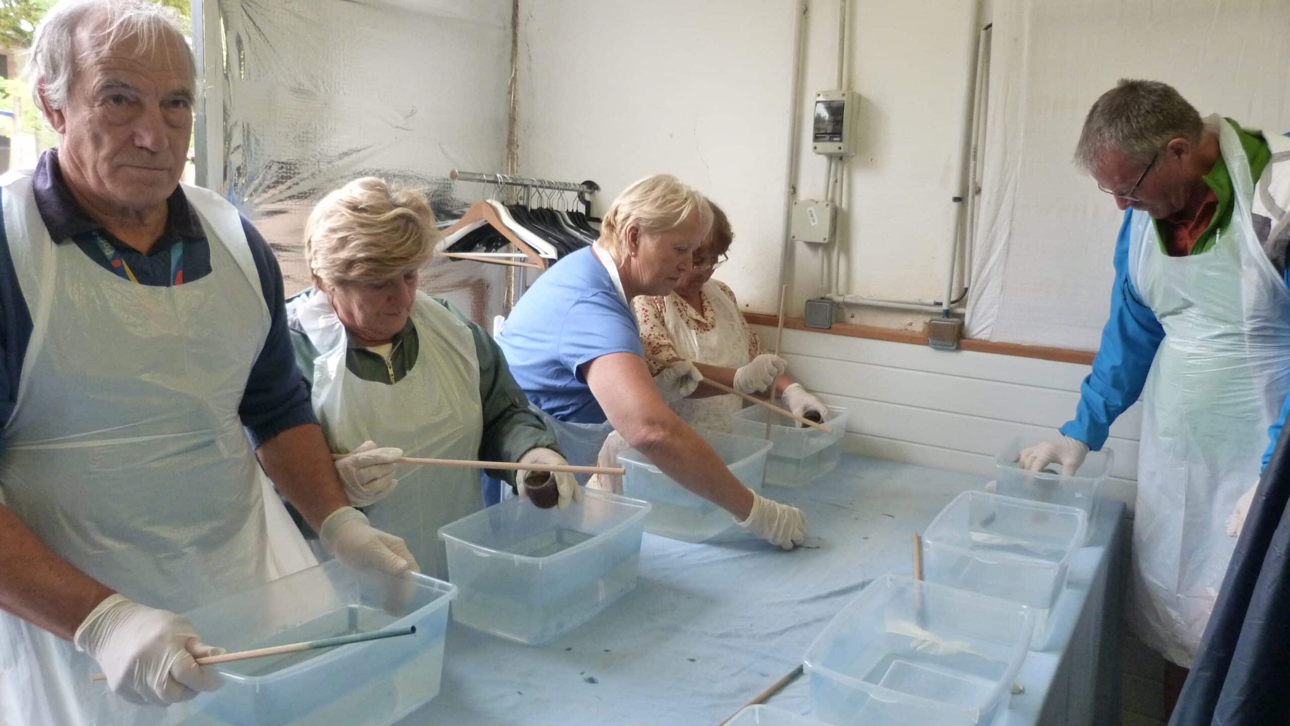 Récolte des feuilles : Les feuilles de guède sont récoltées à la main, lavées et séchées.