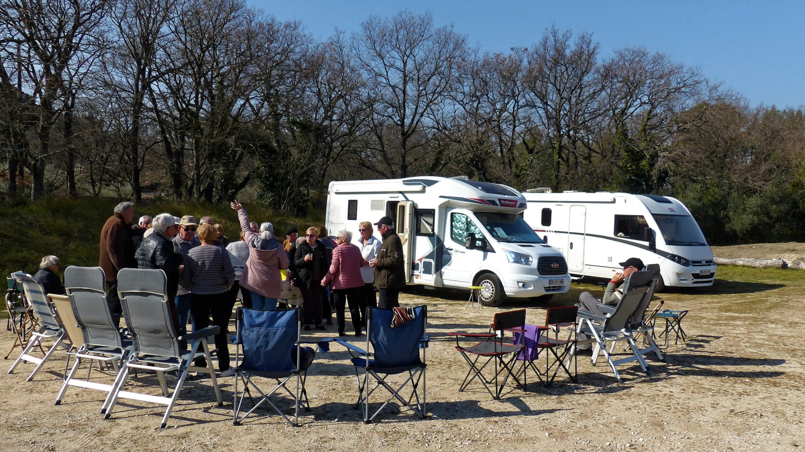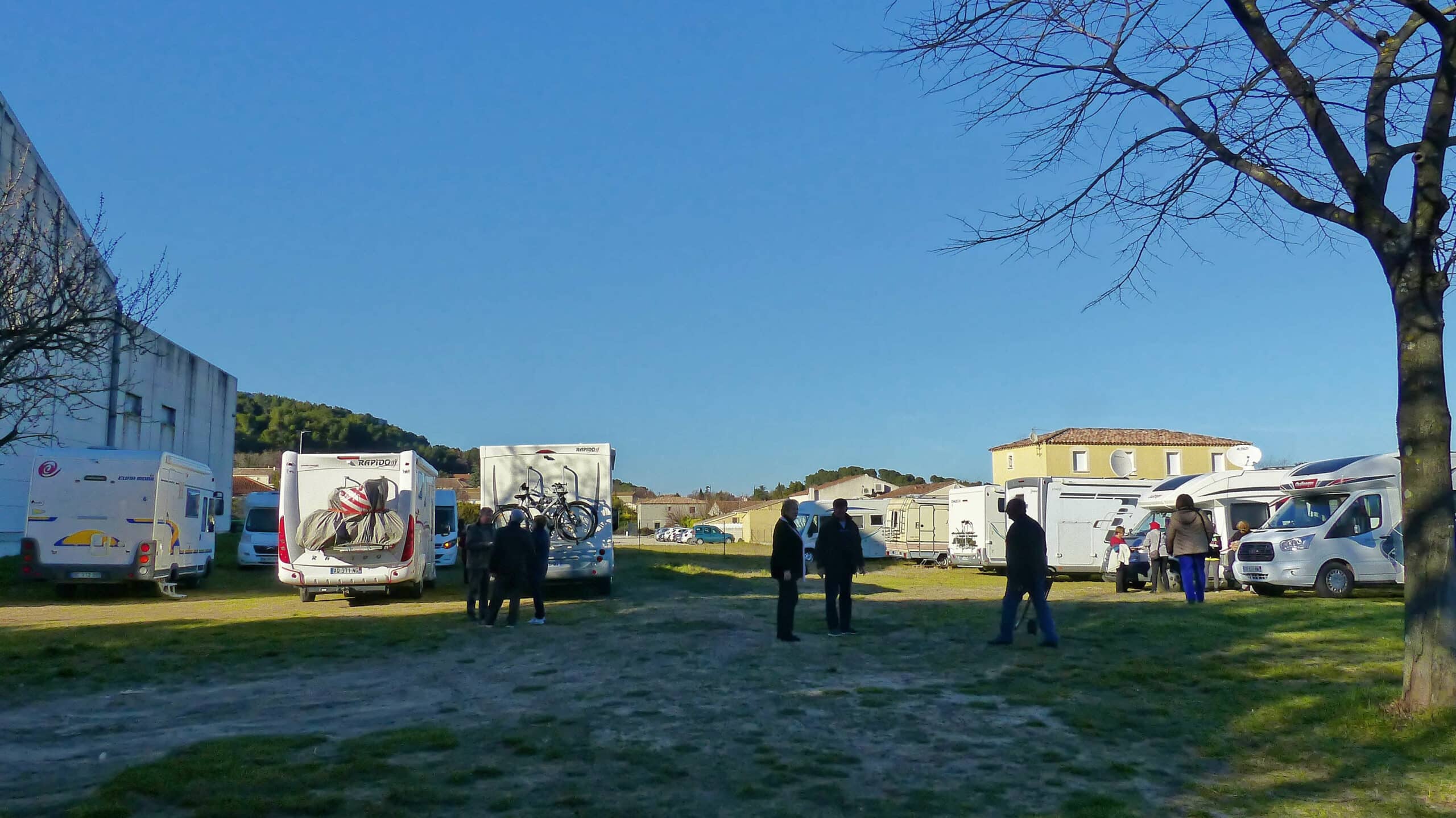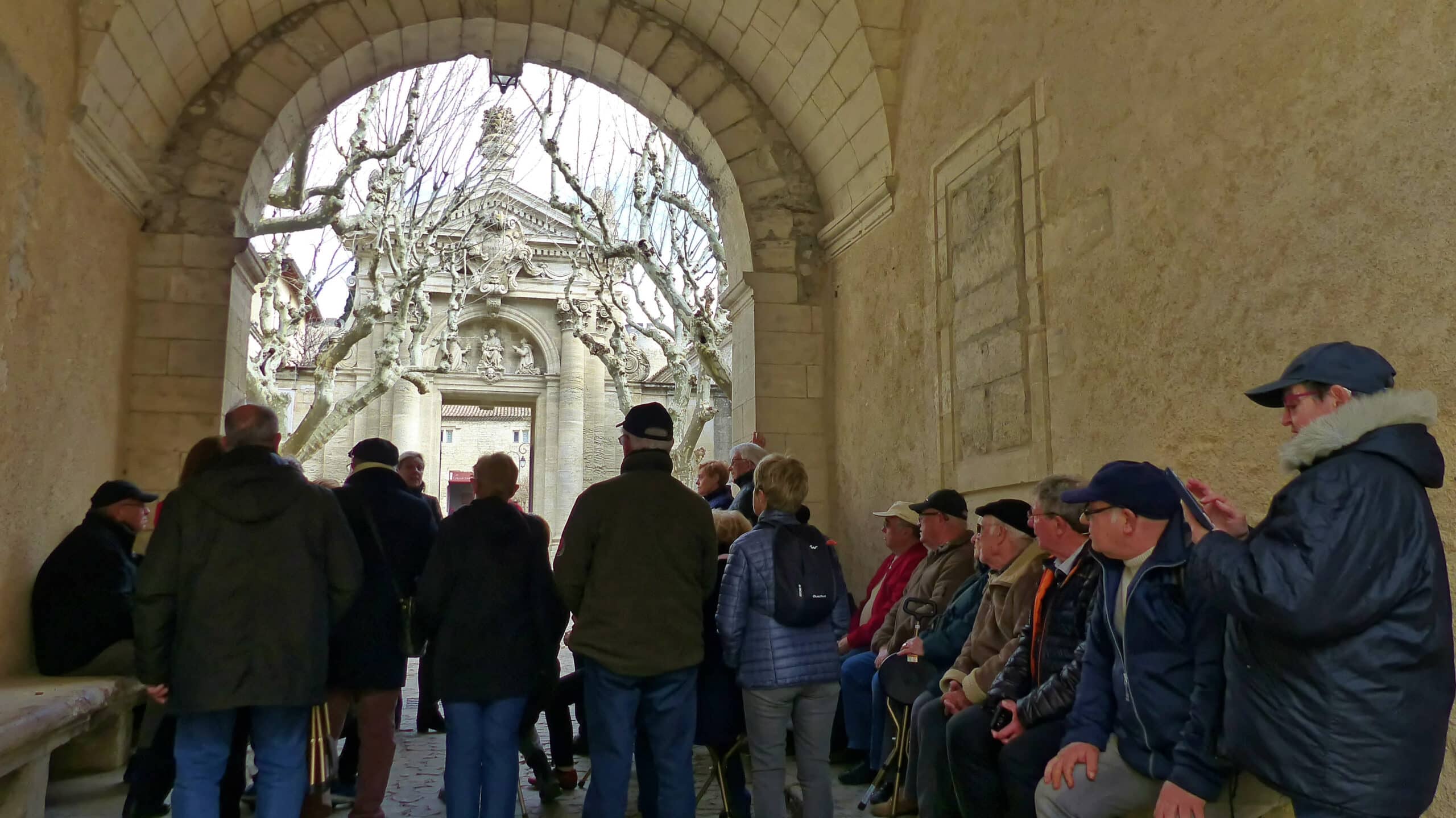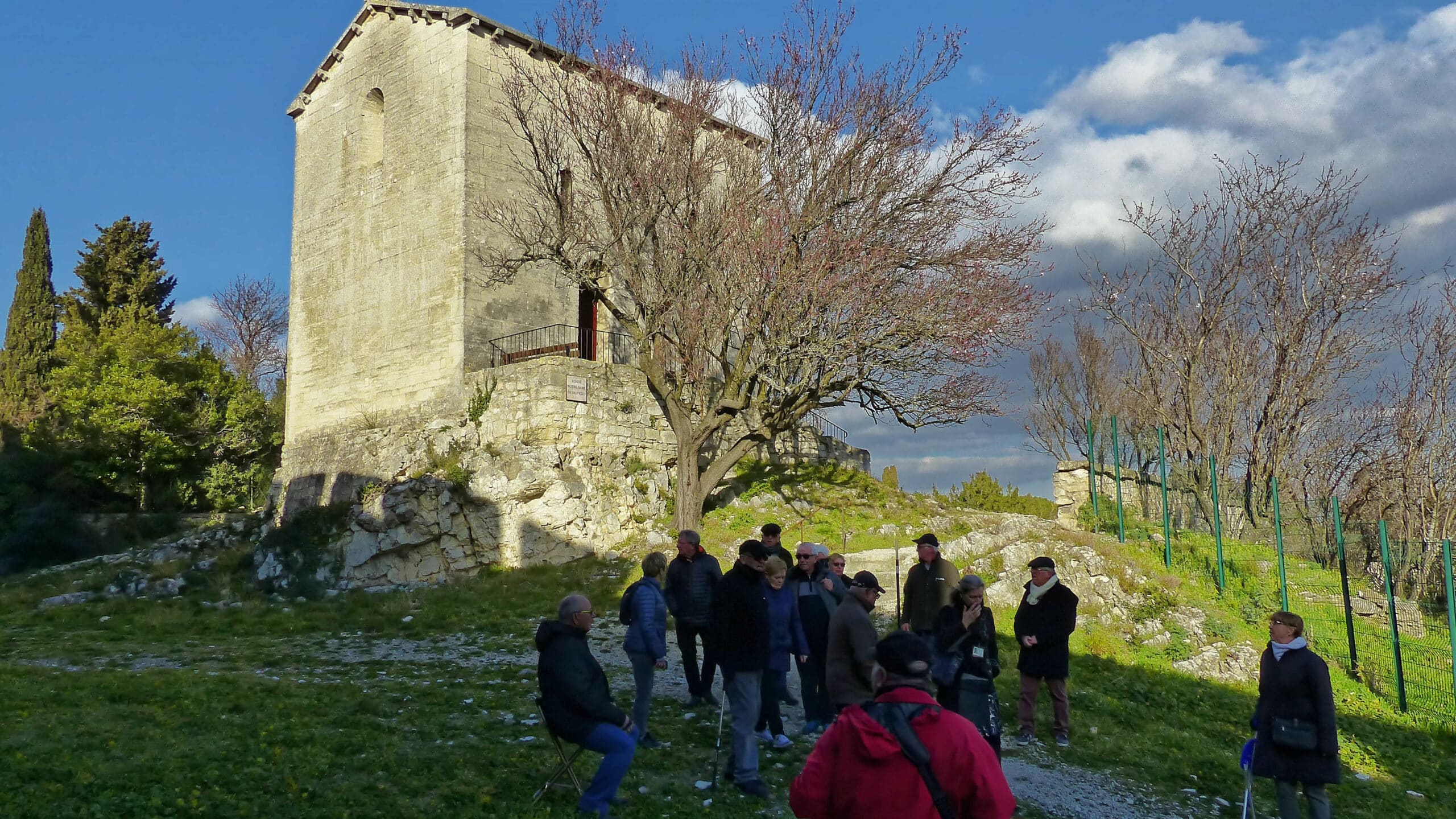 Vendredi 15 février: Dès le matin, direction vers ROQUEMAURE, pour une installation de TROIS jours sur le camping du stade, gracieusement mis à notre disposition par la municipalité. Dès la présence tous les participants, un apéritif de bien venue à été servi. L’Après midi, nous avons commencé par une balade/découverte de Roquemaure, guidés par nos organisateurs Mireille et Gérard Contardo. Mireille nous informe qu’il y a eu, ici, le passage de nombreux trains de déportés vers les camps de concentration. Certains prisonniers ont pu s’évader. La visite de la ville nous a amené devant la maison de naisssance de Placide CAPPEAU, qui a écrit le beau chant de Noël ” MINUIT CHRETIEN”. Ensuite, nous poursuivons par une petite marche pour découvrir une belle vue sur les ruines de châteaux alentours.