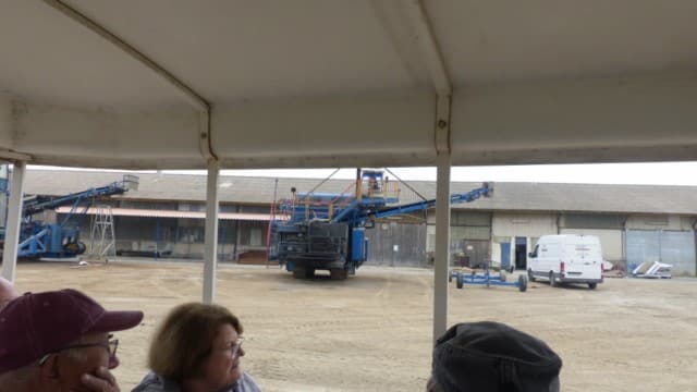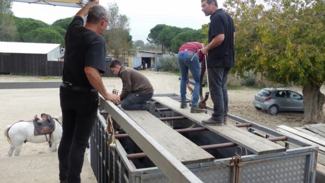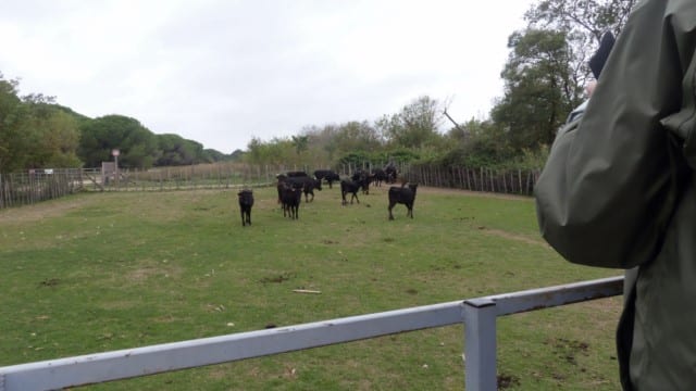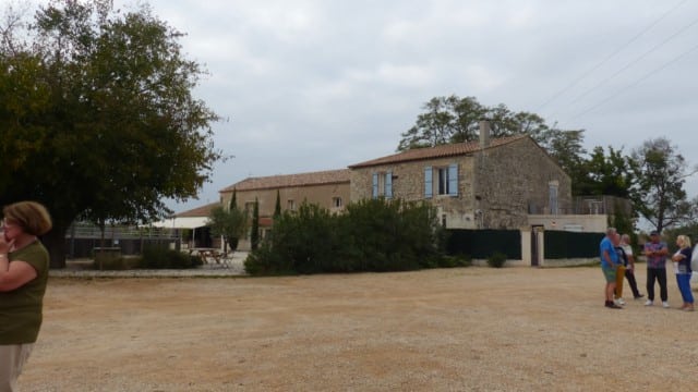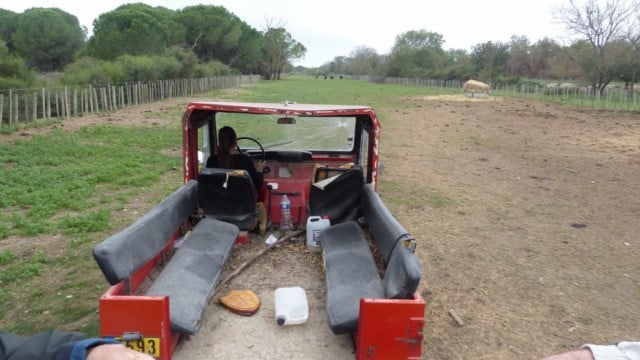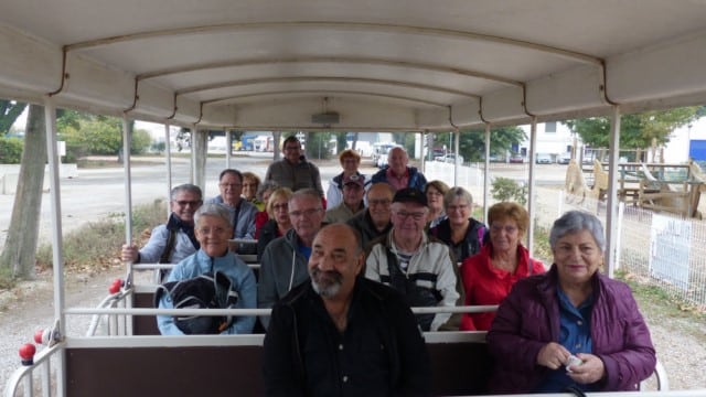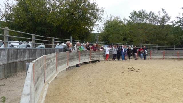 Après cette visite, nous allons chercher nos C.Cars, pour aller au domaine du ” MAS de la COMTESSE” où nous recevons un très bon acceuil, et garons nos véhicules au centre du Mas. Impressionnant ! car nous sommes garés contre un enclos de bestiaux de plus de 500kg !!. Je suis autorisés par une charmante jeune fille, et par des cavaliers, à monter sur le dessus d’un camion dans lequel se trouvent des taureaux. Bon…ça va, …je ne m’approche pas plus.