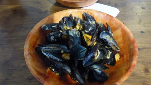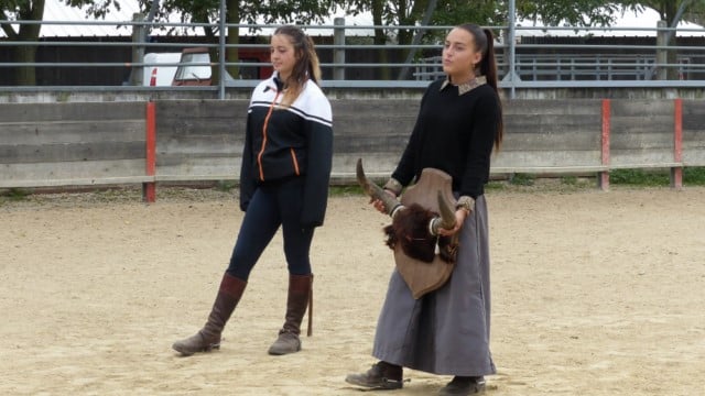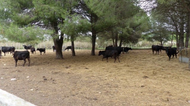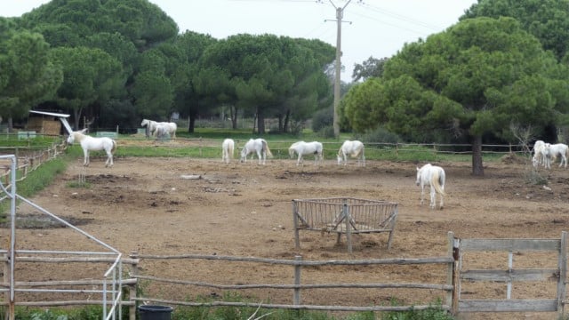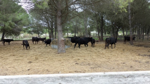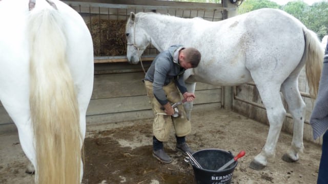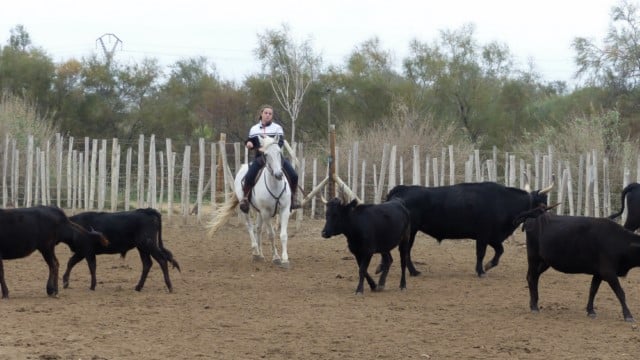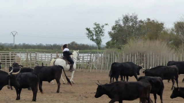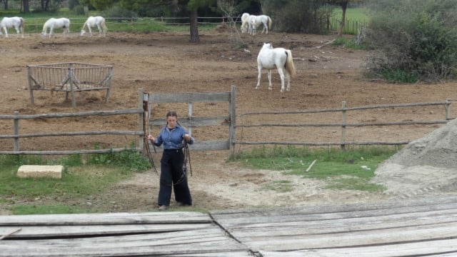 12h30- Apéritif sous la pergola- Brasoucade de moules. Hummm !! extra !. sur un fond de musique Gipsy, par deux jeunes Gitans. Après cet apéritif, direction la salle de restaurant où nous attend une succulente “GARDIANNE”de taureaux… (rab possible). Ensuite, nous sommes invités à découvrir la propriété sur une remorque tractée au milieu des petites bébettes, avant celà ils nous font assister à un “FERRAGE” de cheval. Ensuite, pendant la pénétration du tracteur et de l’équipe dans un enclos a taureaux, on nous demande si quelqu’un veut descendre et s’approcher ! ? ! ? Sapristie NON!. La jeune fille que j’avais rencontré nous fait une petite démonstation de tri à cheval.